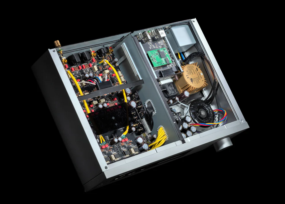 - 採用自家開發演算法的「線性相位延遲 FIR 濾波器」,將收到的音訊取樣率昇頻至 176.4K 或 192K。經昇頻後的數據,會先被儲存在長度約一秒鐘的緩衝記憶體中,再藉由振盪小於 1ps 的精準石英振盪器及時脈校正電路,精確的傳送給 DAC 元件並轉換為類比音樂